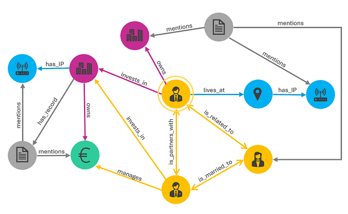 Consider the sample schema in the image below. There are five entity types: people (yellow), physical and virtual locations (blue), documents (gray), companies (pink), and financial accounts (green). Between entities, several relationship types are permitted, e.g., “is_related_to”, “mentions”, and “invests_in”. This is a directed graph meaning that the directionality of the relationship has meaning, i.e., two people are_married_to each other (bidirectional link) and a person lives_at a place (directed link).