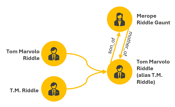 Consider a medical dataset that has a Tom Marvolo Riddle entry and a voter registration dataset that has a T.M. Riddle entry and a Merope Riddle Gaunt entry. In the medical dataset, Merope Gaunt is listed as Tom Riddle’s mother. In the voter registration dataset, there are no family members described. How do the Tom Marvolo Riddle and T.M. Riddle entries get deduplicated when merging the datasets in the graph?, i.e., there should not be two separate nodes in the graph for Tom Riddle and T.M. Riddle as they are the same person. How do Tom Riddle and Merope Gaunt get connected, and how is their connection specified as in the image below?, e.g., connected, related, mother/son? Is the relationship weighted?